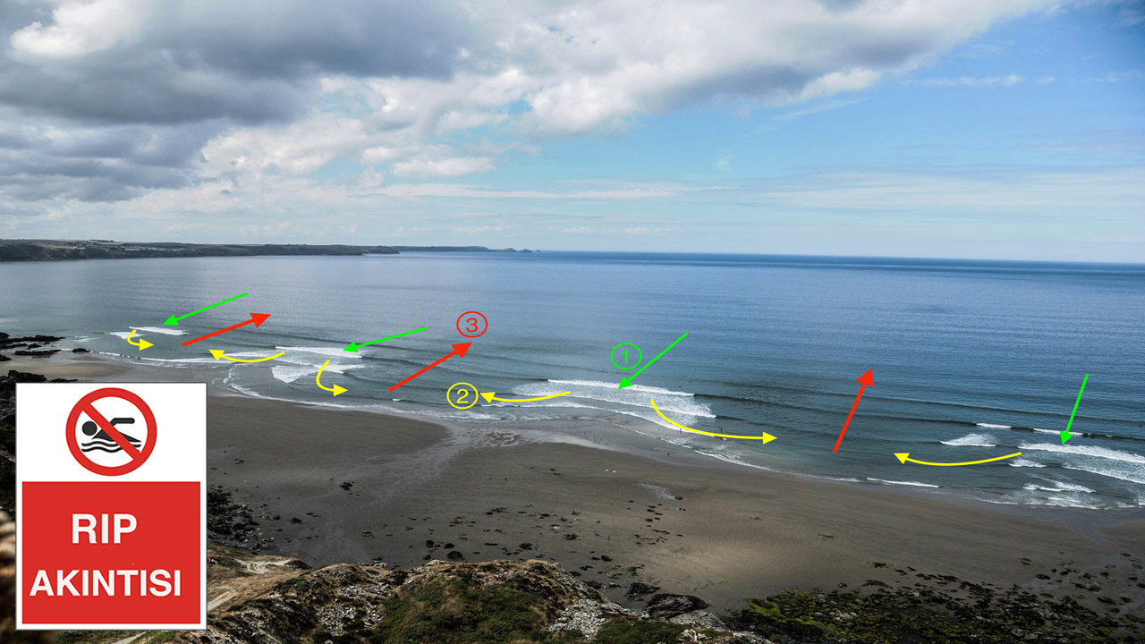 Çoğu insanın, gelen bir dalga zannettiği şey aslında bir akıntı olabilir. Kumsaldan denize doğru veya sahil boyunca açığa doğru çeken bir su kanalının olup olmadığı ile ilgili olarak çevredekilerden bilgi toplayın veya uyarı tabelalarını dikkate alın. Uzaktan baktığınızda farklı görünen bir hareketlilik varsa o bölgeden kaçının. Bir rip akıntısı küçük ve köpürücü olabilir veya kırılma dalgaları arasında sessiz bir boşluk olabilir. Çevredeki sudan biraz farklı bir renkte olabilir.