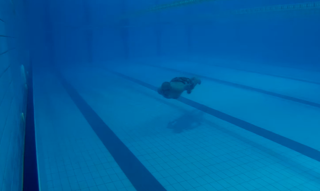 Vücudumun havuz zeminine olan pozisyonuna dikkat edin tamamen yere paralel değil, hareketi uygularken ileri doğru ivme kazanmaya çalışırken aslında ben ileri doğru değil, aşağı-ileri doğru hareket ediyorum. Bunun sebebi; Aşağıda uzun süre kalabilmek için ciğerlerimizi hava ile dolduruyoruz. Durum böyle olunca, suyun kaldırma kuvveti bizi yukarı doğru atacaktır.